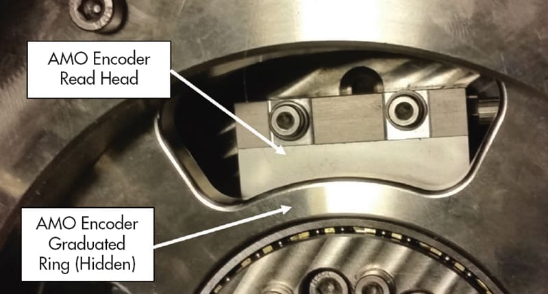 The AMO angle encoder used is the combined flange-mounted WMFA ring and two WMKA absolute reader heads that seamlessly communicate with the system using the EnDat 2.2 interface to connect with ETEL TMB+ motors and AccurET 300 drive control. “While other interface options are available, this entire package was chosen because it was made up of all HEIDENHAIN brand components, which offered a big risk reduction in implementation,” added Romine. “That’s not available anywhere else and afforded me the luxury of avoiding a lot of debugging that I just didn’t have to do. It’s an extremely high-accuracy and reliable positioning system.”