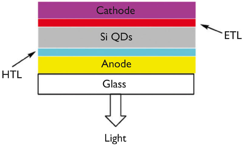 Silicon QD LEDs are continuously advancing in flexibility and efficiency, offering the capability to produce “single-wavelength” devices and white light emitters through an ordered distribution of QD sizes. Coupled with the stability and efficiency of silicon nanocrystals, these materials are appropriate for use as light spectrum generators for blue or near-UV high brightness LEDs.