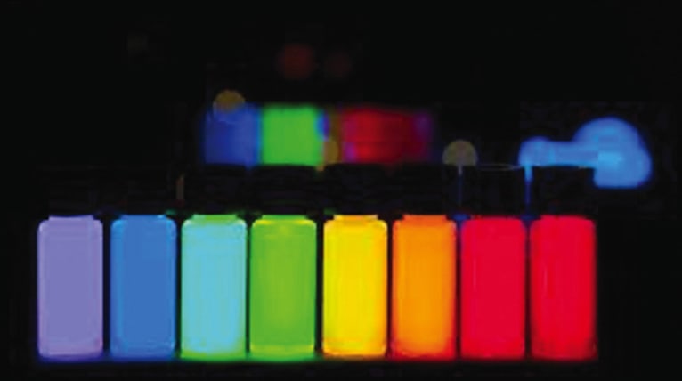 An attractive alternative that circumvents many of the limitations discussed above is the use of semiconductor quantum dot (QD) based LEDs. QDs are semiconductor nanoparticles, scaling between 2 nm and 20 nm, that display unique electronic and optical properties. Their small size (smaller than the exciton Bohr radius) confines the motion of electrons and holes in all three spatial directions, which then creates atomic-like energy level spacing that is inversely proportional to the square of its size.
