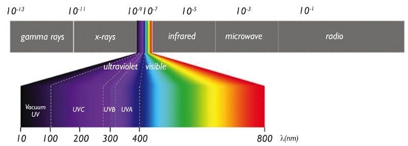 Much of the commercially available 200-280 nm UV LEDs, the portion of the electromagnetic spectrum highlighted in Figure 1, consist of AlN or AlGaN materials grown on sapphire or other exotic substrates by molecular beam epitaxy or chemical vapor deposition methods. There are significant hurdles to these devices being scalable and manufactured at a price that would achieve wide-scale market adoption. These III-V materials also have poor light extraction efficiencies which limit their performance. Additionally, sapphire and most semiconductor-based substrates have large lattice mismatches.