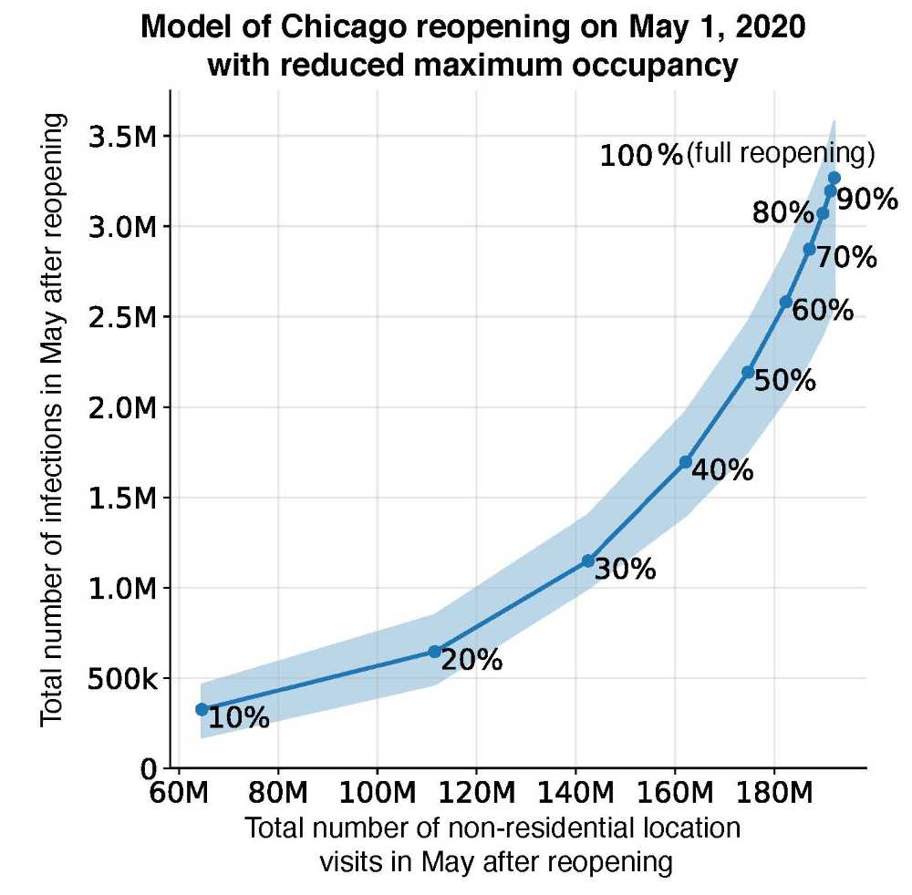 - Reopening does not have to be “all-or-nothing”: strategies like reducing maximum occupancy can enable us to reopen more efficiently by providing a large reduction in infections for a relatively small reduction in visits.