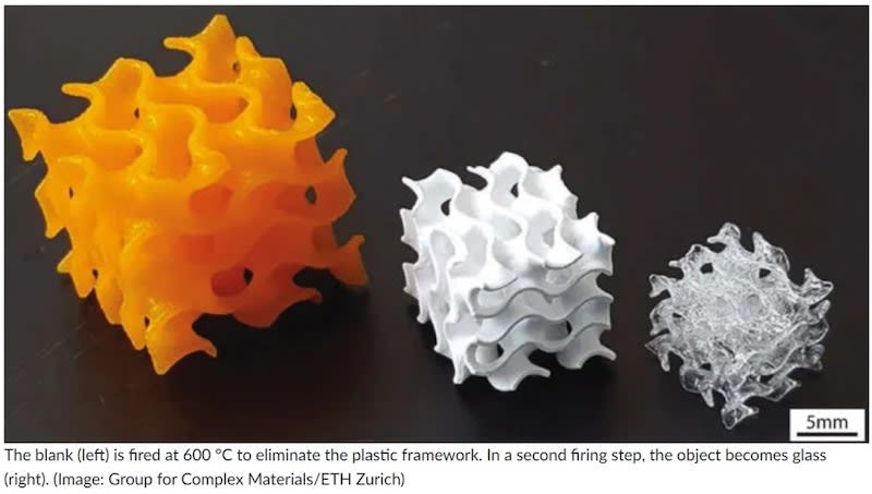 A digital light-processing 3D printing platform exploits the photopolymerization-induced phase separation of custom resins to create glass parts with complex shapes, high spatial resolutions, and multi-oxide chemical compositions. It uses a 3D-printable resin made of inorganic precursors, a photoactive monomer mixture, and a light-absorbing dye. The printing process uses a commercially available desktop digital light processing (DLP) printer.