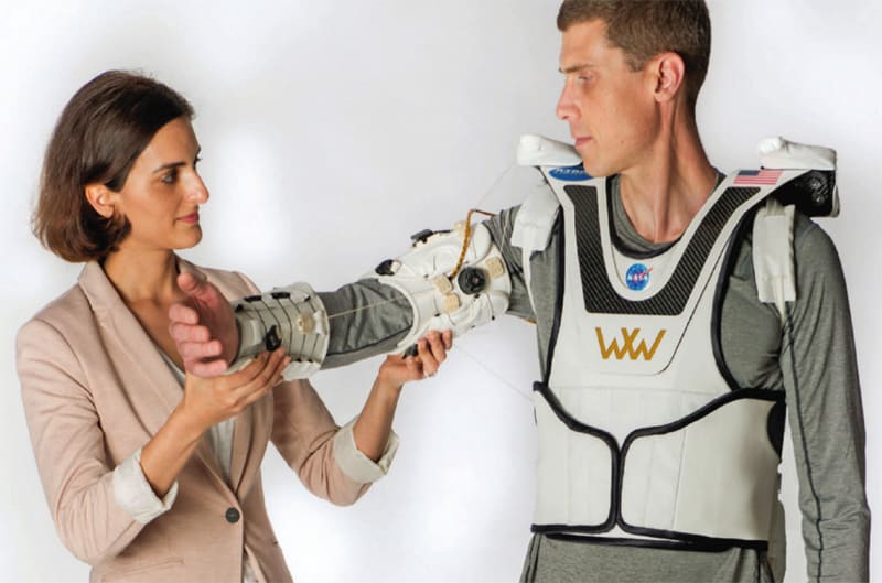 NASA’s robotic device is “plug and play” — it includes all necessary electronics, actuation, software, and sensors required to achieve augmented limb movement. The garment is designed such that the human-robot interface distributes load across the torso, maximizing user comfort. Donning and doffing is simple, as the device lowers over the head, straps to the torso via Velcro®, and possesses adjustable custom arm cuffs. Actuators are housed in the back of the garment that pull custom conduit-tendon-based systems attached to the limb at optimized locations, causing the joint of interest to move to the specified orientation. Force sensing is employed to enable optimal control of the limb, measuring user-applied force to maintain commanded joint orientations. Integrated electronics and software provide power distribution, safety monitoring, data transfer, and data logging.