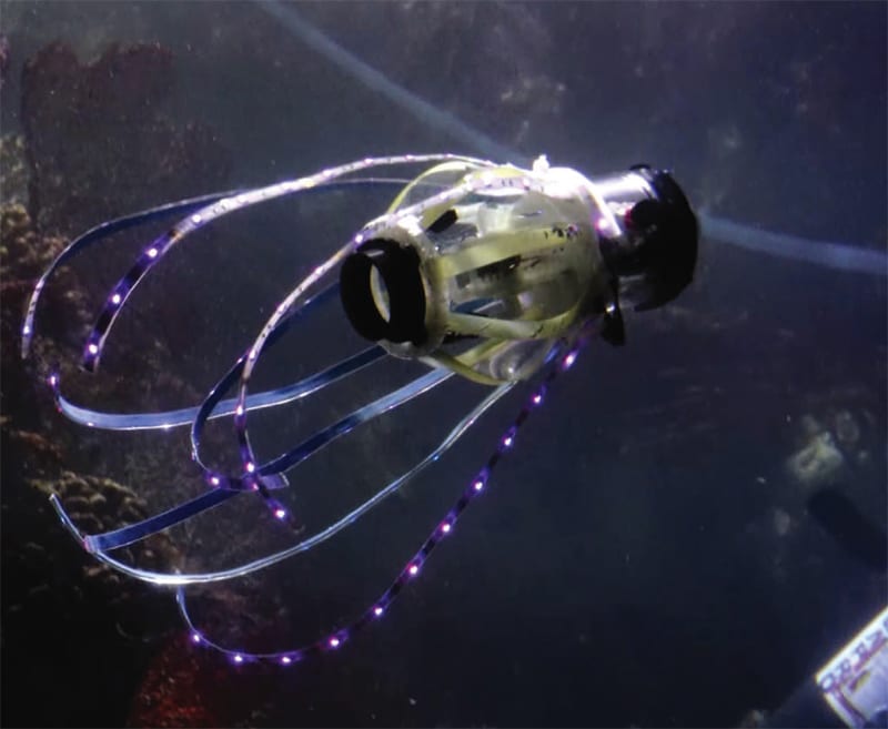 MAE engineers built a squid-like robot that can swim untethered, propelling itself by generating jets of water. The “squidbot” carries its own power source inside its body and can also carry a sensor, such as a camera, for underwater exploration. Th squidbot is made mostly from soft materials, such as acrylic polymer, with a few rigid, 3D-printed, and laser-cut parts. The robot takes a volume of water into its body while storing elastic energy in its skin and flexible ribs. It then releases this energy by compressing its body and generates a jet of water to propel itself. (Read our October 2020 Tech Briefs Q&A with the creators of the squidbot.)