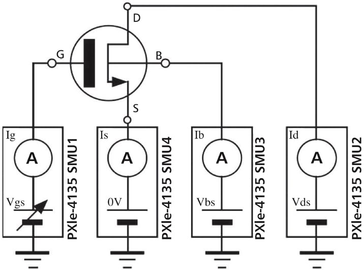 The failure mechanics usually tested comply with Joint Electron Device Engineering Council (JEDEC) standards for common WLR stresses. They include time-dependent dielectric breakdown (TDDB),hot carrier induced degradation (HCI), and bias temperature instabilities (BTI/NTBI). The wiring setup to test these mechanics on transistors in a wafer includes four source measure units (SMUs), each tied to the Source, Drain, Gate, and bulk terminals and a switching matrix. (Figure 1)