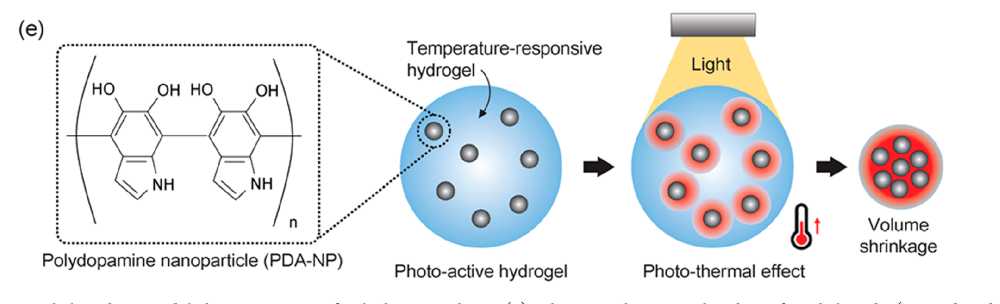 Upon light irradiation, the nanoparticles generate heat to de-swell the hydrogel matrix, which in turn stretches the middle hydrogel sac containing the desired pigment.