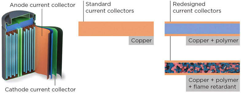 Scientists have re-engineered one of the heaviest battery components — sheets of copper or aluminum foil known as current collectors — so they weigh 80% less and immediately quench any fires that flare up. If adopted, this technology could address two major goals of battery research: extending the driving range of electric vehicles and reducing the danger that laptops, cellphones, and other devices will burst into flames. This is especially important when batteries are charged quickly, creating more of the types of battery damage that can lead to fires.