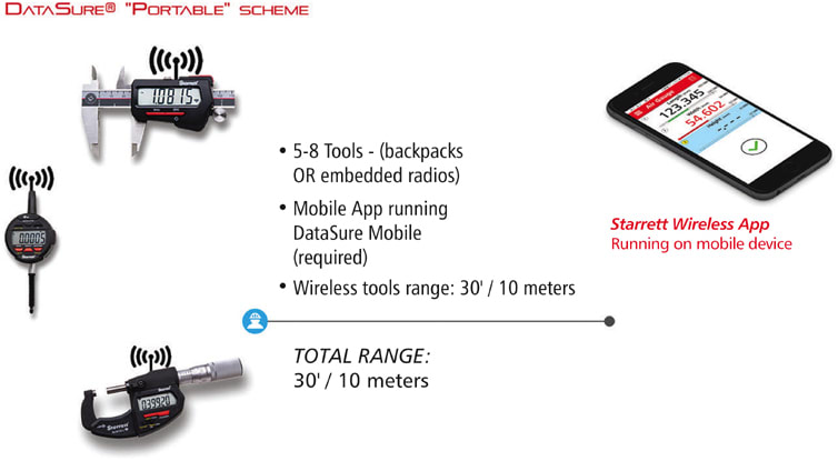 In its simplest application, a Portable Scheme features a wireless app running on a mobile device. This straightforward setup can have one wireless measuring tool with an embedded radio transmitting data up to 30 feet (10 meters) to a mobile device. Or, depending on the mobile device, a Portable Scheme may have 5 to 8 measuring tools that connect to the mobile app for data transmission up to 30 feet (10 meters). Also, users can easily transmit measurement data up to 30 feet (10 meters) from one (or more) wireless measuring tool(s) to a laptop or PC that has a USB gateway ( Figure 1).