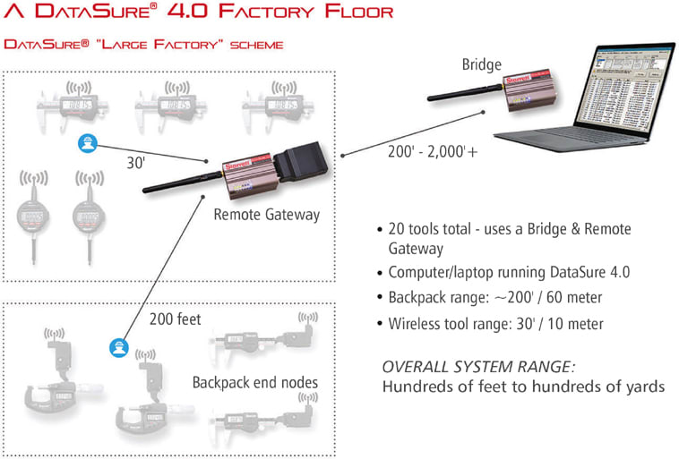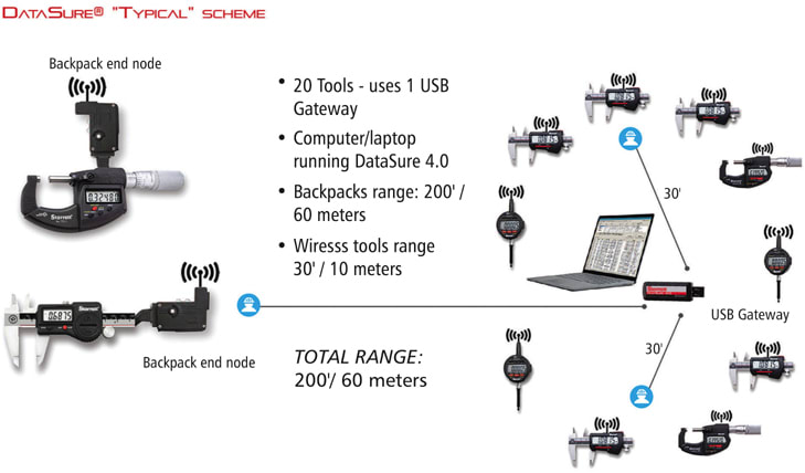 In a Typical Scheme, the manufacturer could have a computer or laptop running the measuring data collection system to support 20 measuring tools in the data collection process over a distance of up to 200 feet. In this setup, one USB gateway is included and backpack end nodes on the measuring tools increase the transmission range from 30 feet to 200 feet (Figure 2).