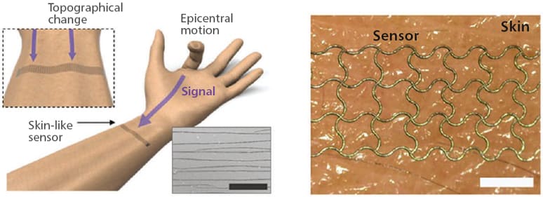 A powered, single-strained electronic skin sensor was developed that can capture human motion from a distance. The strain sensor, placed on the wrist, decodes complex five-finger motions in real time with a virtual 3D hand that mirrors the original motions. The deep neural network boosted by rapid situation learning (RSL) ensures stable operation regardless of its position on the surface of the skin.