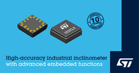 The IIS2ICLX from STMicroelectronics Geneva, Switzerland) is a high-accuracy, low-power, 2-axis digital inclinometer for use in applications such as industrial automation and structural-health monitoring. It features a programmable machine-learning core and 16 independent programmable finite state machines that help edge devices save power and reduce data transfers to the cloud.
