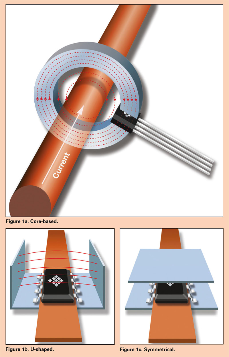 In general, there are three approaches to contactless current sensing, as shown in Figure 1. These include the core-based sensor, the U-shaped sensor, and the symmetrical 'sandwich' shielded sensor. While comparing all three is difficult due to the number of variables presented by unique applications, it is useful to measure performance based on a typical scenario. In this instance, the sensors were evaluated using a 20 mm wide by 2.5 mm thick busbar with a rectangular cross-section, carrying 1000 A.