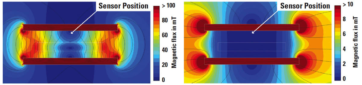 The biggest advantage of the symmetrical shielding configuration is that the hysteretic error can be fully compensated. This is because the fields in each of the two soft magnetic materials used in the shielding have opposing field orientations. By careful design, the two shields can effectively cancel out any residual magnetic field created by the current flows.