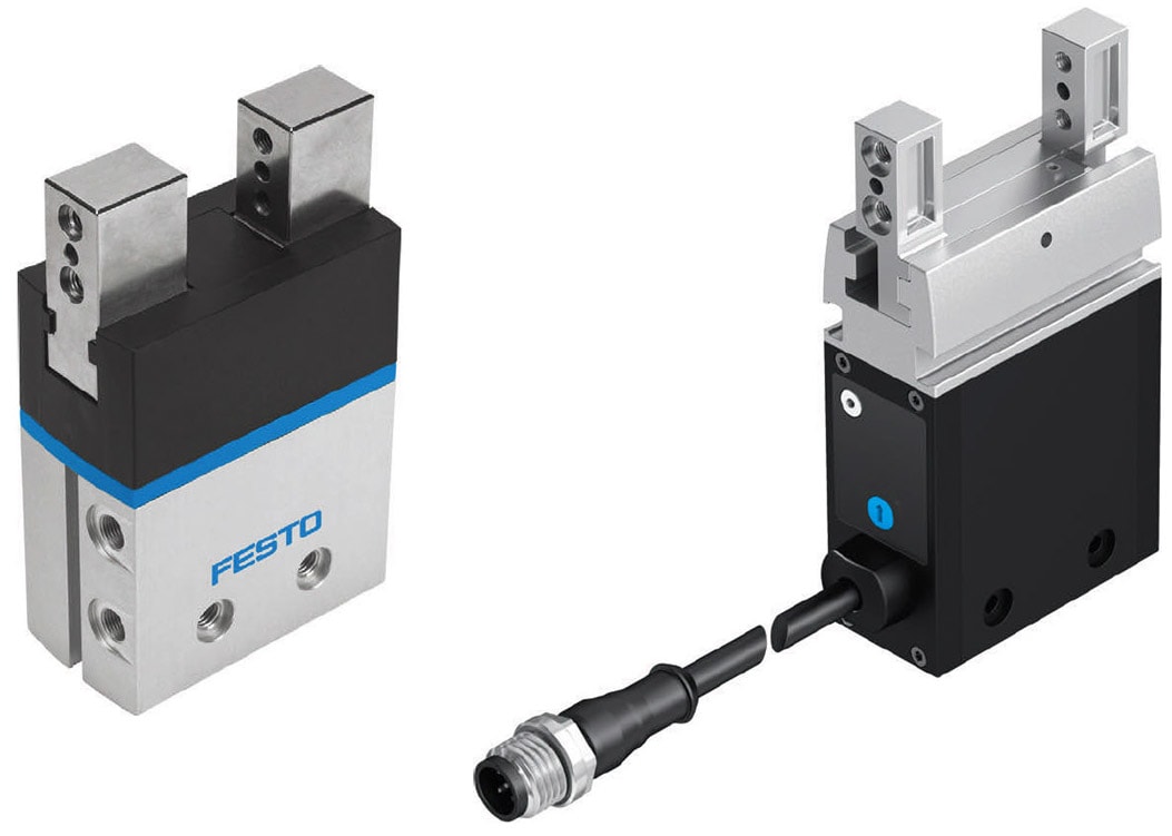 Whether electric or pneumatic, mechanical grippers fall into several design classes. Parallel grippers, for example, incorporate fingers that pull directly apart. Two-finger designs are the most common, making up 85 percent of the mechanical gripper market, while three-finger designs are suitable for handling round objects or performing centering functions. Other examples include radial and angular grippers that feature fingers that open at an angle. Radial grippers open to 180 degrees, making them suitable for applications involving varying or inconsistent workpiece sizes. Angular grippers tend to be faster than 180-degree designs and open to roughly 30 degrees.
