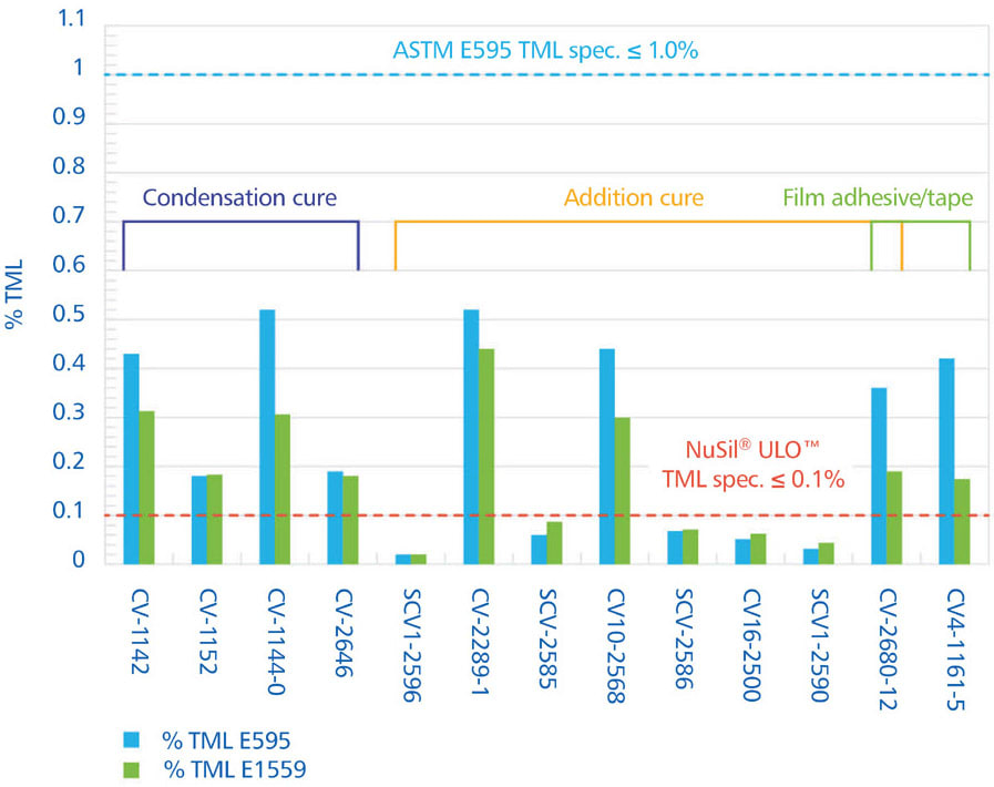In Figure 1, the percent of TML at the end of testing is compared using ASTM E595 versus ASTM E1559. Figure 2 lists the NuSil ® space-grade silicones that were tested, along with their cure chemistry and the application for each silicone tested.