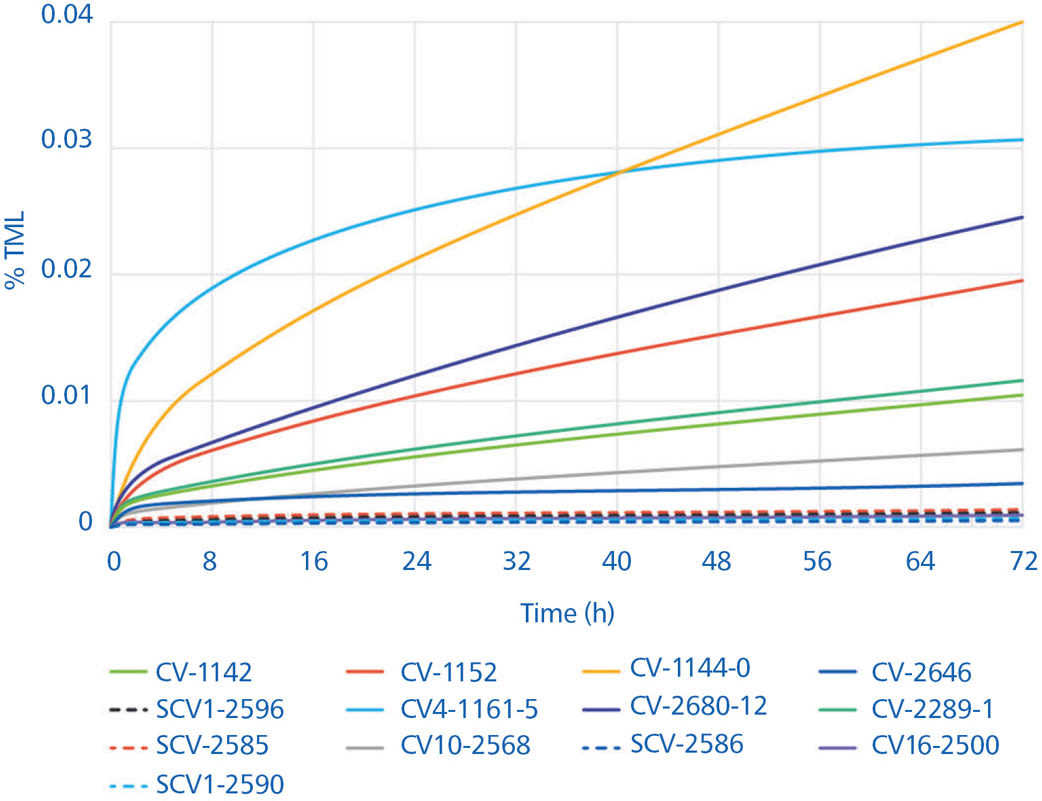 Recently, a silicone manufacturer analyzed a suite of its products, including condensation and addition cure materials, using both ASTM E595 and E1559 to detail and compare the purity and stability of the company’s low-outgassing (CV product designation) and ultra-low-outgassing product lines (SCV product designation) and their effects on outgassing kinetics.