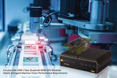 Cincoze (New Taipei City, Taiwan) has expanded the Cincoze GM-1000’s machine vision application performance with two new Quadro MXM GPU modules. Building on the GM-1000’s processing base, the MXM-RTX3000 and MXM-T1000 provide the additional GPU capacity for rapid adoption of machine vision in smart factories, from simple environmental perception applications such as positioning, measurement, identification, and sorting, to more complex vision-guided automation functions. GPU requirements for each scenario are different, so specifications must match the environment and application. The two new Quadro® MXM GPU modules broaden the GM-1000’s available selection to cover a wider range of uses.