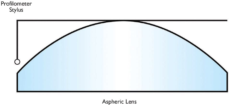 During manufacturing, an asphere is typically measured using a tactile profilometer. With increased size of the optic, it is also likely that the sagittal height is increased (but this very much depends on the actual design of the asphere). Another limiting factor of a tactile profilometer, in addition to the travel range, is the height of the stylus used. This limits how much it is able to reach over the vertex of a convex asphere to measure the profile of the surface on the opposite side (Figure 2).