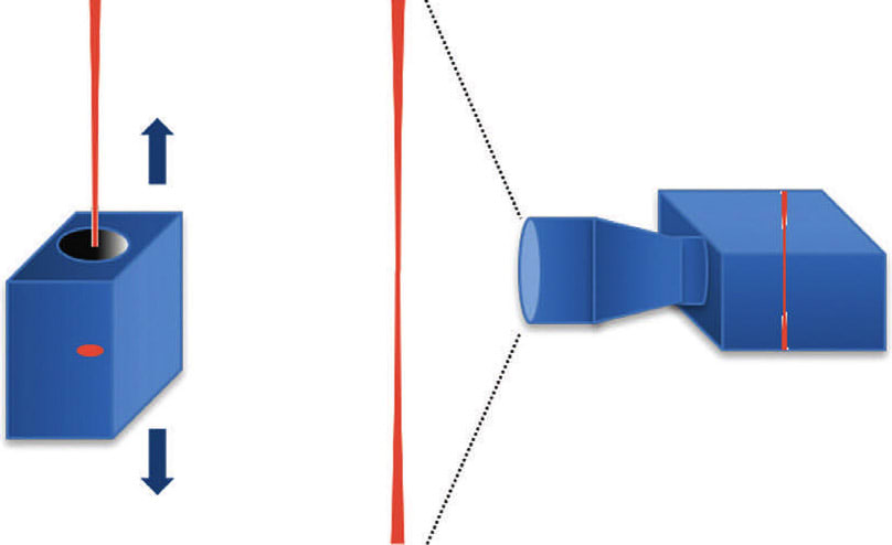In order to draw reliable conclusions about the laser beam caustics, one requires either a camera-based measurement system or a non-contact method for measurement. Figure 3, left, shows a camera-based measuring device that must be moved along the z-axis in order to find the focus position by means of the determined beam profiles. Rapid changes in the focus position are therefore difficult to detect. On the right is a schematic representation of a non-contact measurement technology, which shows that the caustic of the entire beam is recorded at once. Here, a change in the focus position shows up immediately and is resolved in space and time.