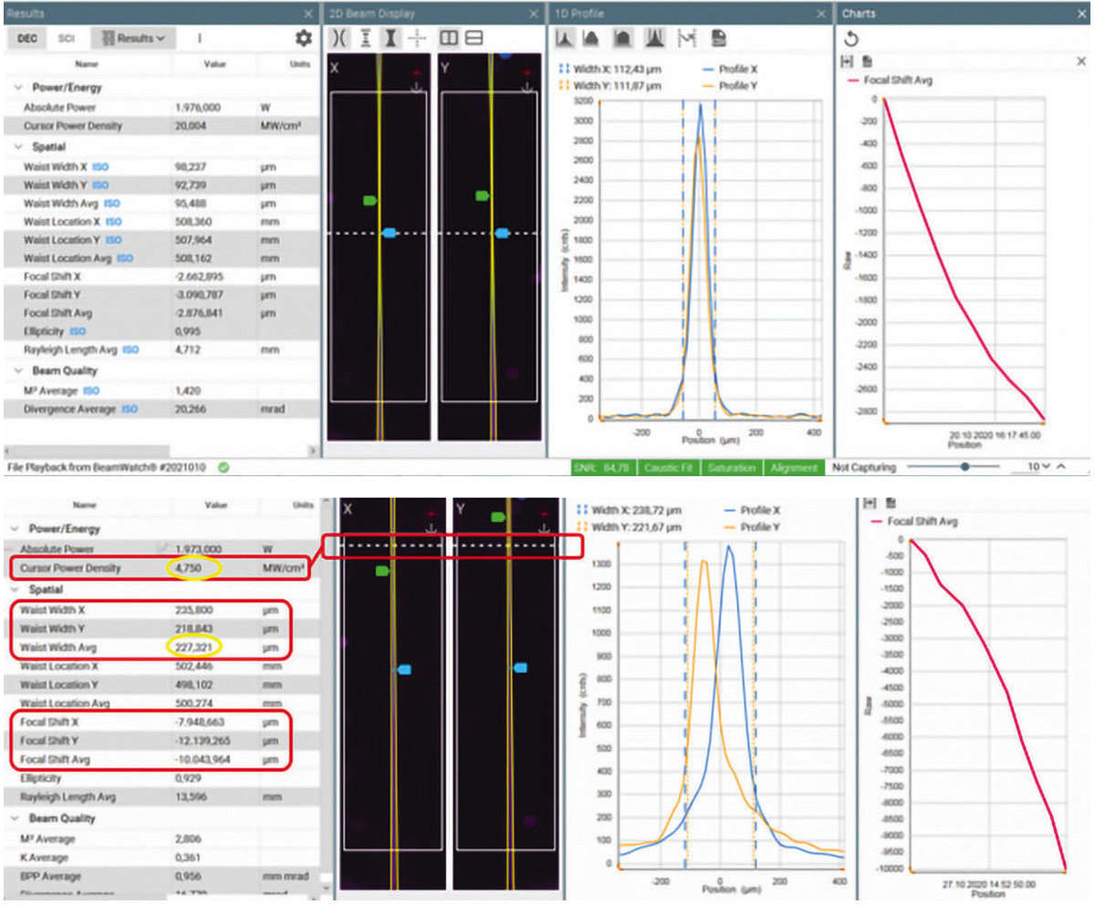 Especially in the field of automated production, non-contact measurement of the laser beam proves to have a bright future. In sensitive areas, such as the manufacture of gearboxes or battery packs, new products combine multiple measurement methods in a single system. In the Ophir BeamWatch Integrated system, for example, beam caustics can be recorded using non-contact measurement technology; a water-cooled measuring head for high-power lasers determines the laser power; and the measurement data is passed on to the production network via integrated interfaces (Profinet, Ethernet/IP, CC-Link, GigE). Different welding heads and parameters can also be tested. By capturing the beam at video frame rates, focus shift can be detected in near real time, as shown in Figure 4. Here, a dirty protective window was to blame for the shift in focus.
