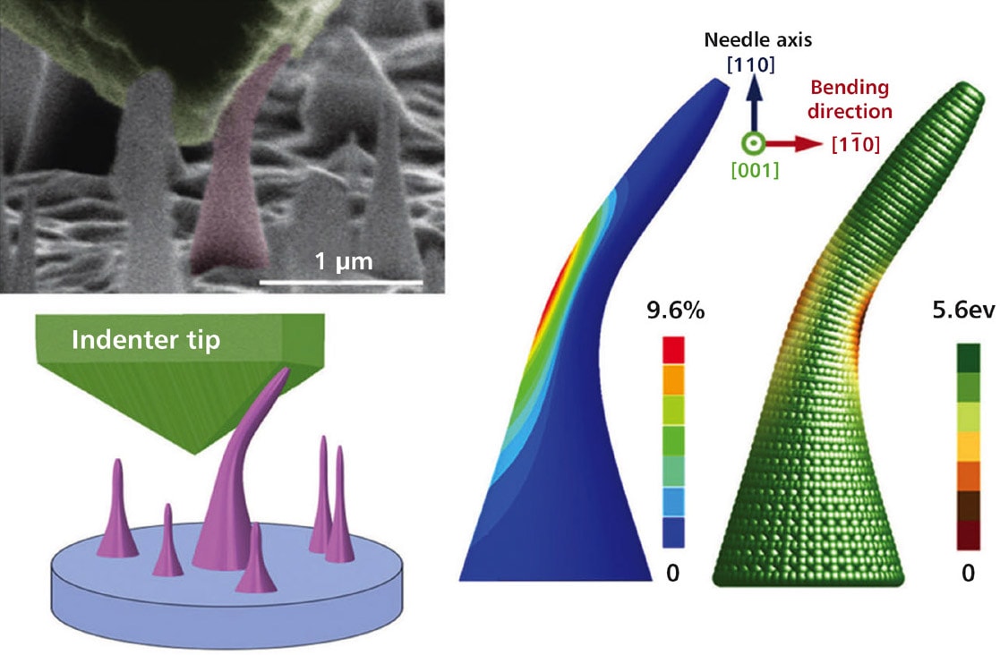 The concept of straining a semiconductor material such as silicon to improve its performance found applications in the microelectronics industry more than two decades ago; however, that approach entailed small strains on the order of about 1%. The new method uses the concept of elastic strain engineering, which is based on the ability to cause significant changes in the electrical, optical, thermal, and other properties of materials simply by deforming them — putting them under moderate to large mechanical strain — enough to alter the geometric arrangement of atoms in the material's crystal lattice but without disrupting that lattice.