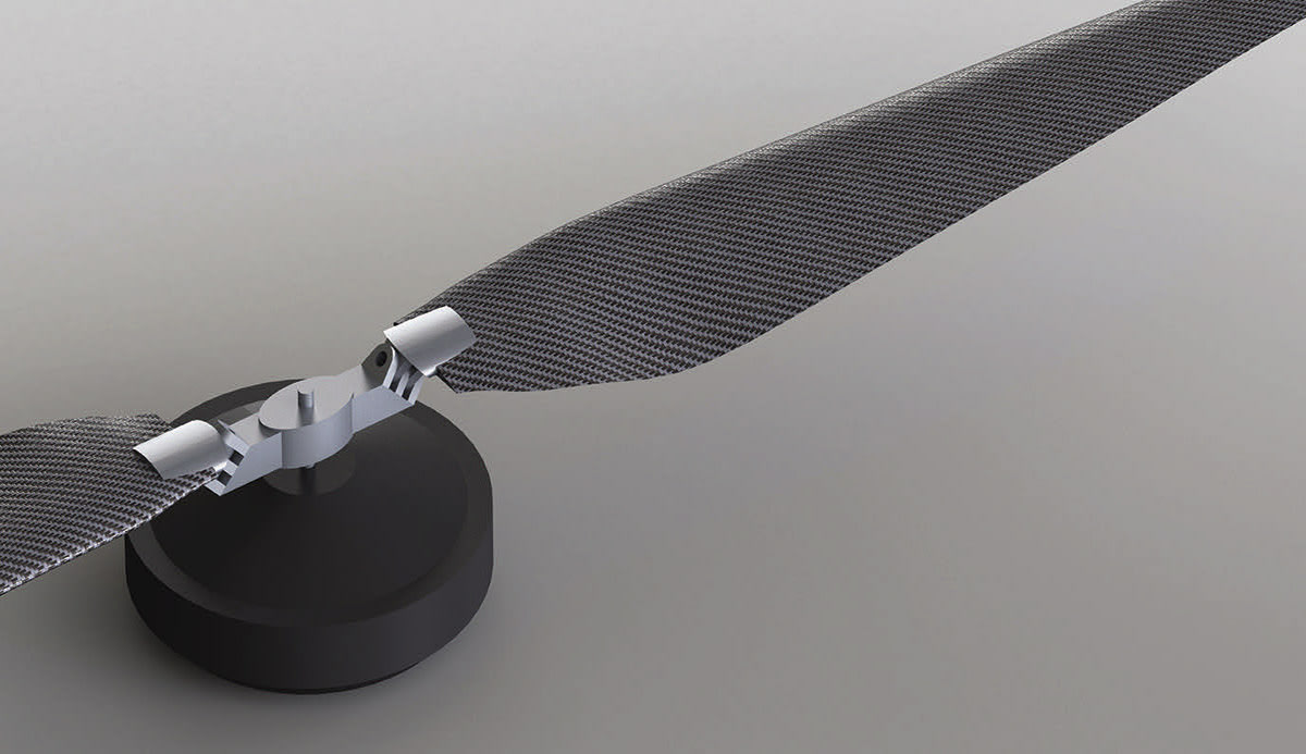 Researchers invented a hinge that improves how quickly a quadrotor the size of a king-sized mattress can ascend from the ground to the rooftop of a two-story building, particularly with large payloads. The hinge is located at the root of the quadrotor blade next to the hub so that the blade pitch changes with rotor speed.