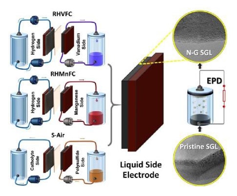 The technology combines carbon-based electrodes with economically sourced electrolytes, (manganese or sulphur, which are abundant chemicals) by means of a simple, yet highly effective electrophoretic deposition (EPD) of nano-carbon additives (nitrogen-doped graphene), which enhances the electrode durability and performance significantly in highly acidic or alkaline environments.