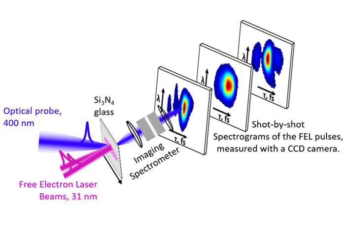 New research shows how to measure the super-short bursts of high-frequency light emitted from free electron lasers (FELs). By using the light-induced ionization itself to create a femtosecond optical shutter, the technique encodes the electric field of the FEL pulse in a visible light pulse so that it can be measured with a standard, slow, visible-light camera.