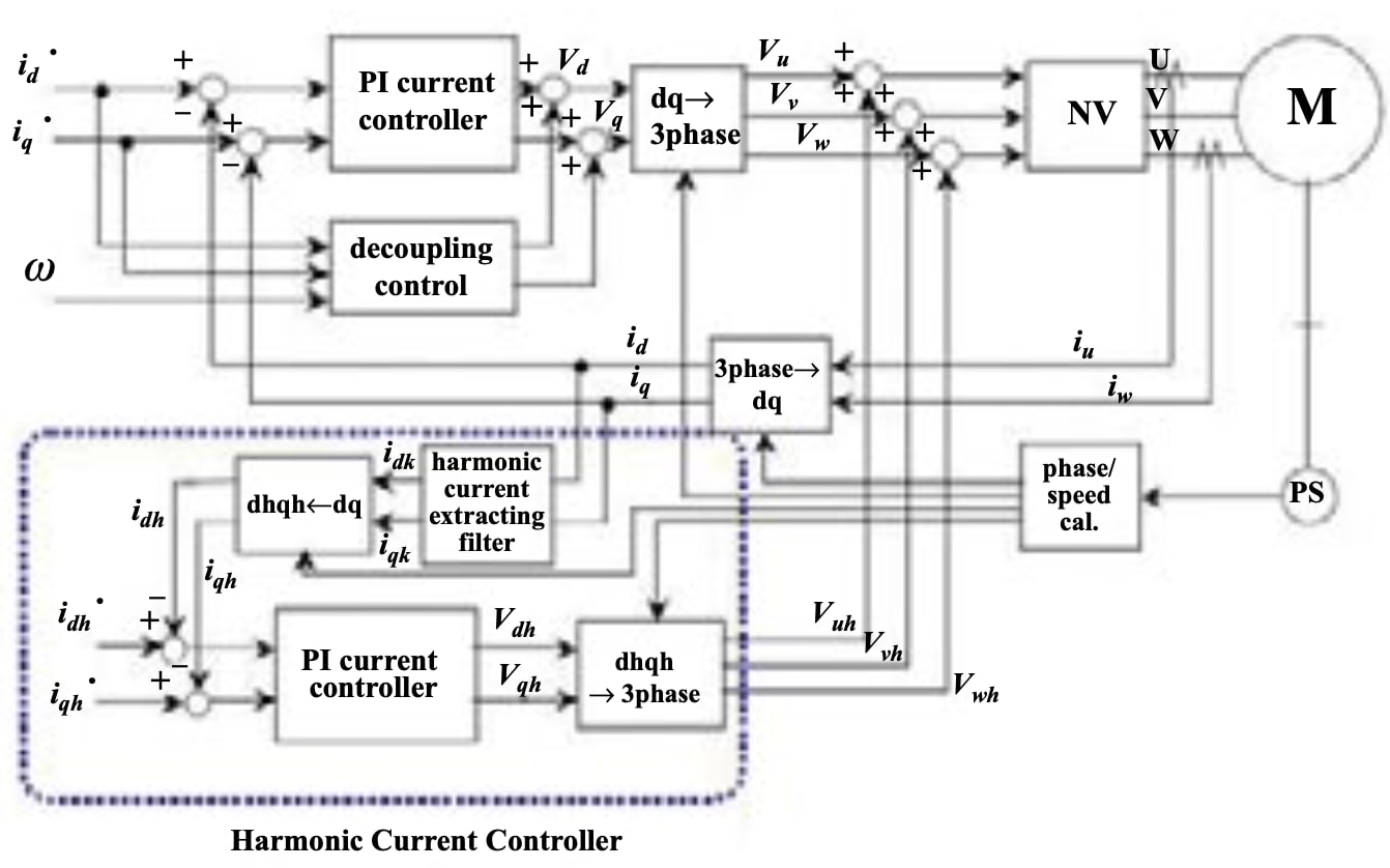 By suppressing or controlling harmonic currents and voltages of the motor to overcome torque ripple, this system improves the efficiency and torque performance of an AC motor, especially permanent magnet synchronous motors (PMSM), which are very popular in industry due to high efficiency and small volume compared to other types of motors. Many PMSMs use a concentrated winding for the benefit of simple manufacturing and low cost, and they have large spatial harmonics. PMSMs are controlled by conventional vector control drives, but voltages and current harmonics present in the motor can deteriorate accuracy and efficiency. Compared to conventional vector control, this technique further improves efficiency and torque performance by reducing the harmonics.