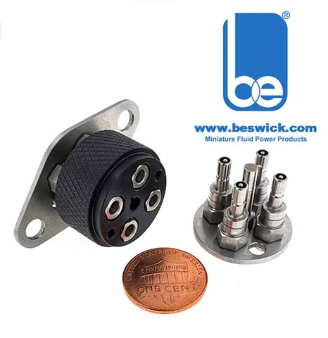 Beswick Engineering (Greenland, NH) offers the QDM34L series four-line, dry break quick disconnect. The design minimizes dead volume to eliminate leakage when making or breaking connections. Both the internal and external ends include shutoff mechanisms that remain fully closed during disconnection and remain closed until completely connected. They are equipped with a keyed location pin and are available in 303 stainless steel. Each line has an M3 threaded port for connecting fluid lines.