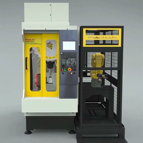 Methods Machine Tools (Sudbury, MA) offers the JobShop Cell PRO automation solution incorporating a main enclosure with several different pre-engineered end-of-arm and infeed/outfeed options. It features an industrial-grade, articulating FANUC 6-axis robot in an aluminum enclosure that allows a RoboDrill to be placed on the left or right side or in a twin cell with two machines. Removable panels on the common enclosure allow for several different infeed and outfeed options including conveyors, drawers, lazy susan style pallet systems, and interfaces for vibratory and other bulk feeding solutions. The RoboDrill offers multi-axis simultaneous machining with a 10,000 or 24,000 RPM BBT-30 spindle. Customers may choose from a 3, 4, or 5-axis configured RoboDrill and an array of standard hydraulic or pneumatic workholding options.