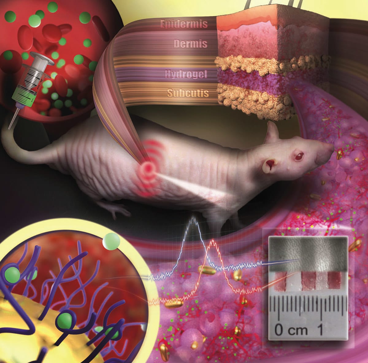In their study the researchers implanted their gold nanoparticle sensors under the skin of hairless rats. Color changes in these sensors were monitored following the administration of various doses of an antibiotic. The drug molecules are transported to the sensor via the bloodstream. By binding to specific receptors on the surface of the gold nanoparticles, they induce color change that is dependent on drug concentration. Thanks to the color-stable gold nanoparticles and the tissue-integrating hydrogel, the sensor was found to remain mechanically and optically stable over several months.