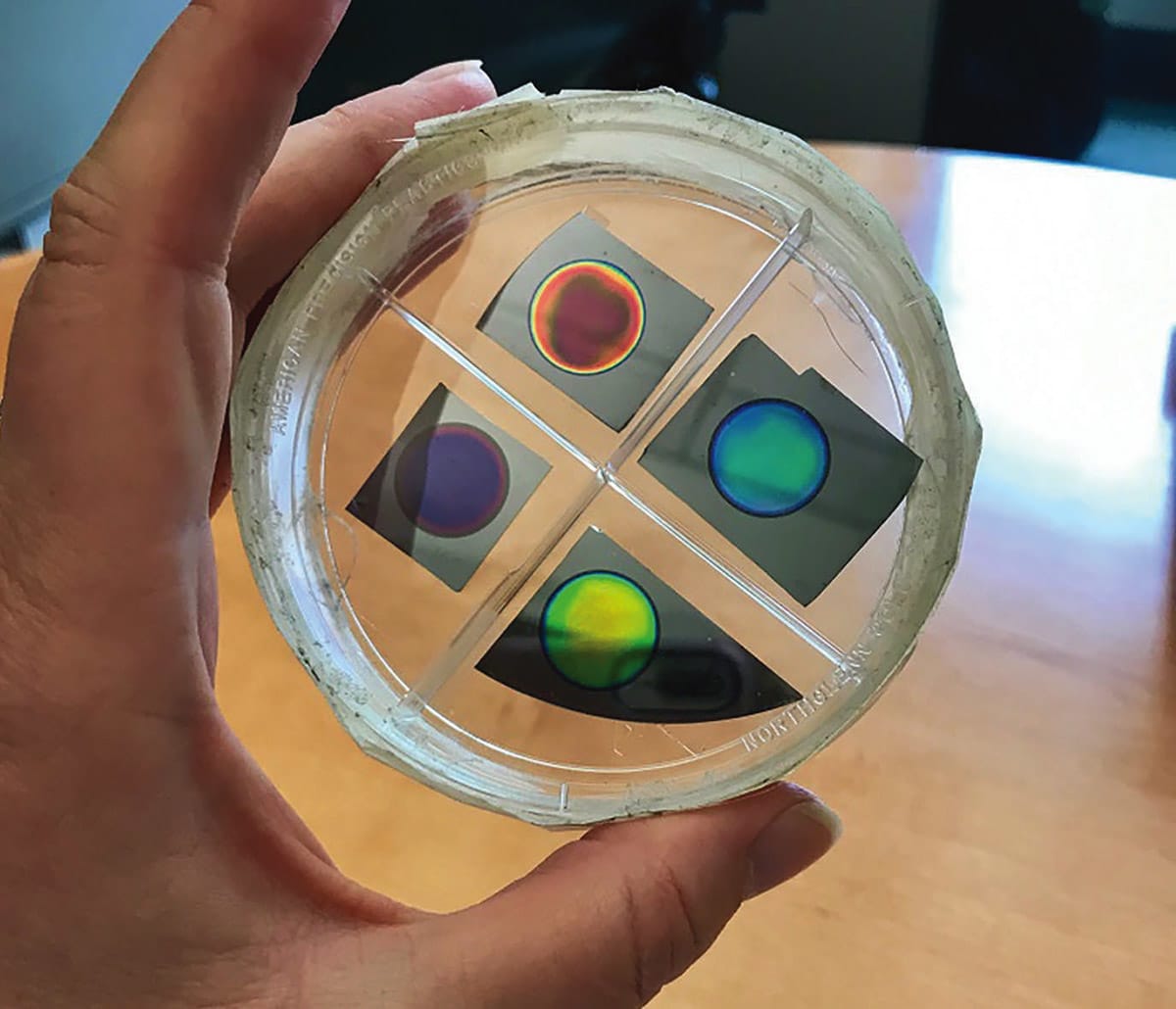Low-cost, nanostructured thin films of silicon feature nanoscale holes that are a thousand times smaller than a strand of hair. They selectively capture molecules when pre-treated with the appropriate surface coating, darkening the silicon, which the app detects.