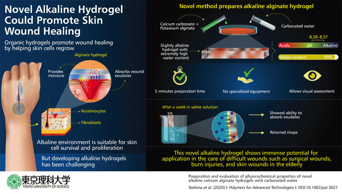 The scientists prepared a novel alkaline alginate hydrogel (pH 8.38-8.57) suitable for wound healing via a method that requires no special equipment and can be carried out at room temperature. This, in addition to the fact that the hydrogel forms in five minutes, makes it ideal for potential use in any medical practice for superior wound healing. The method involves mixing calcium carbonate and potassium alginate and then adding carbonated water to this mixture and letting the gelation (gel formation) process take place. In this method, the pH of the gel shifts to alkaline because the carbon dioxide volatilizes after gelation. This also ensures transparency of the gel, which in turn allows the visual assessment of wounds and helps in easily ascertaining the progress of healing. Also, regardless of the amounts of ingredients used, the resultant hydrogels have extremely high water content — up to 99%.
