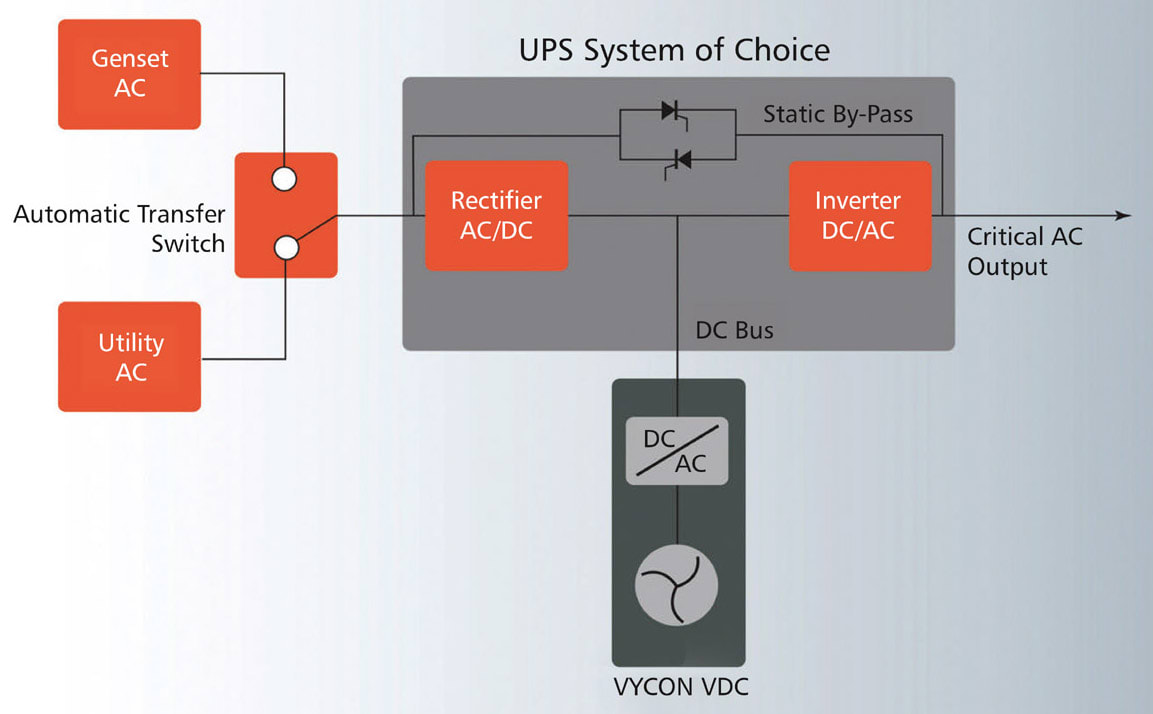 Flywheel systems connect to the UPS’s DC bus just like a battery bank, receiving charging current from the UPS and providing DC to the UPS inverter during discharge (Figure 1). Upon loss of utility power, up to 450 kW of regulated DC power per flywheel is delivered instantly to the UPS. This provides the power needed to start and transition to the generators during a prolonged outage. Multiple flywheels can be paralleled for longer run times or N+1 redundancy.