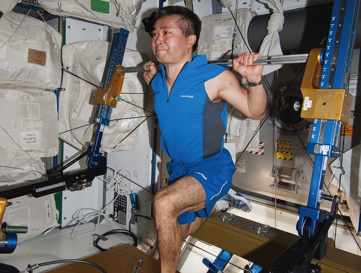 A person who is inactive for an extended period of time (such as when they have a long illness) loses strength as well as muscle and bone mass. Astronauts on the International Space Station (ISS) face similar risks because bones and muscles begin to atrophy in the absence of gravity. Resistive exercise, where the musculoskeletal system bears weight, has been shown to mitigate these effects. But just lifting weights, as we do on Earth, does not work without gravity.