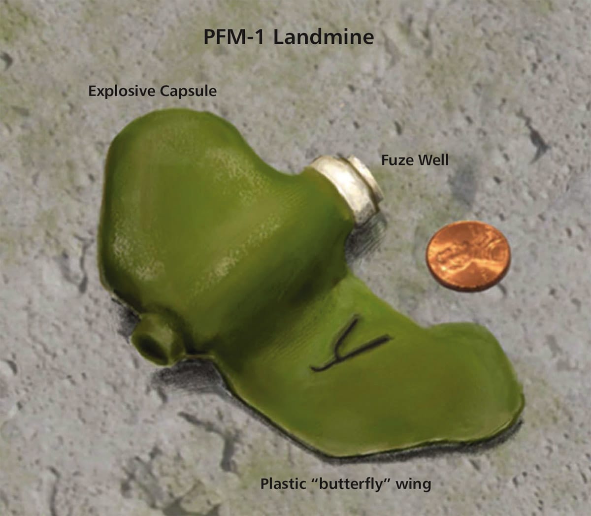 It is estimated that there are at least 100 million military munitions and explosive devices in the world of various size, shape, and composition. Millions of these are surface plastic landmines with low-pressure triggers, such as the mass-produced butterfly landmine. Nicknamed for their small size and butterfly-like shape, these mines are extremely difficult to locate and clear due to their small size, low trigger mass, and most significantly, a design that mostly excluded metal components, making these devices virtually invisible to metal detectors. The design of the mine, combined with a low triggering weight, earned it notoriety as the “toy mine” due to a high casualty rate among small children who find these devices while playing.