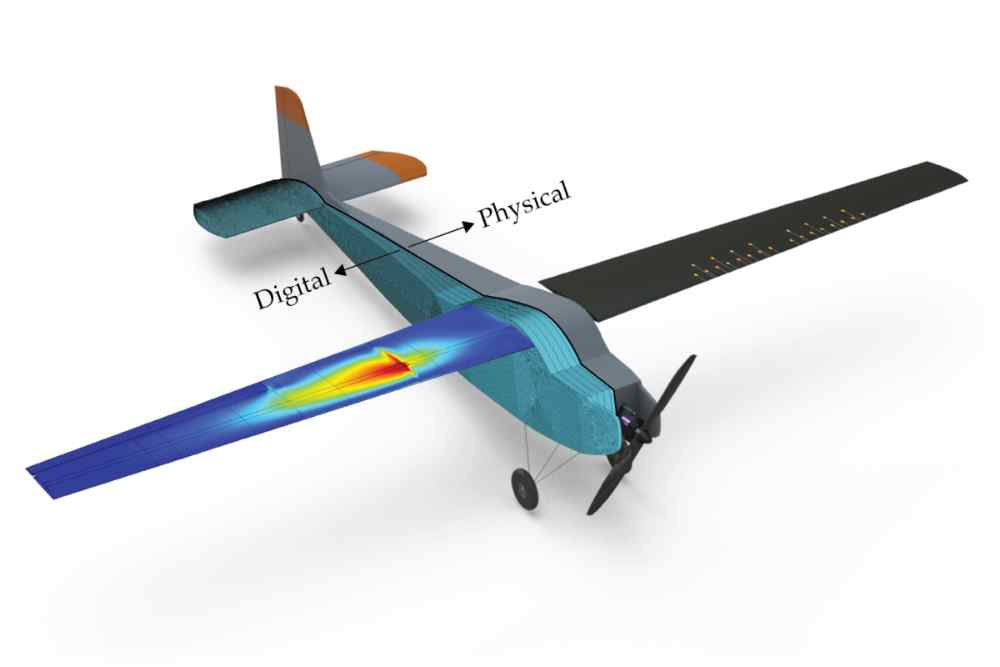 To test their model, the team outfitted a 12-foot-wingspan UAV with sensors from The Jessara Group. The "stickers" collected strain, acceleration, and other relevant data from the UAV, which then informed the virtual representation.