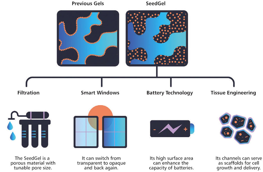 The resulting gel could be far easier to create, as its two solvents are essentially oil and water and its nanoparticles are silicon dioxide — essentially tiny spheres of common quartz. It also could have a variety of industrial uses. The gel is thermoreversible, which refers to an optical property that the finished SeedGel possesses: It can switch from transparent to opaque and back again just by changing its temperature. This property could be harnessed in smart windows that sandwich a thin layer of the gel between two panes of glass or in sensors.