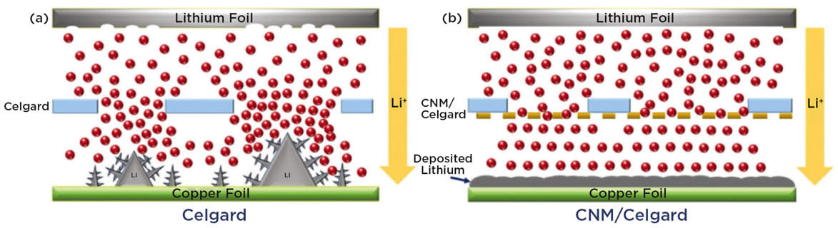 The energy density of traditional lithium-ion batteries is approaching a saturation point that cannot meet the demands of the future; for example, in electric vehicles. Lithium-metal batteries can provide double the energy per unit weight when compared to lithium-ion batteries. The biggest challenge, however, is the formation of lithium dendrites — small, needle-like structures — over the lithium-metal anode. These dendrites often continue to grow until they pierce the separator membrane, causing the battery to short-circuit and ultimately destroy it. Researchers have developed a solution to prevent dendrite formation and thus at least double the lifetime of a lithium-metal battery. During the charge transfer process, lithium ions move back and forth between the anode and the cathode. Whenever they pick up an electron, they deposit lithium atoms, which accumulate on the anode. A crystalline surface is formed, which grows three-dimensionally where the atoms accumulate, creating the dendrites. The pores of the separator membrane influence the nucleation of dendrites. If ion transport is more homogeneous, dendrite nucleation can be avoided.
