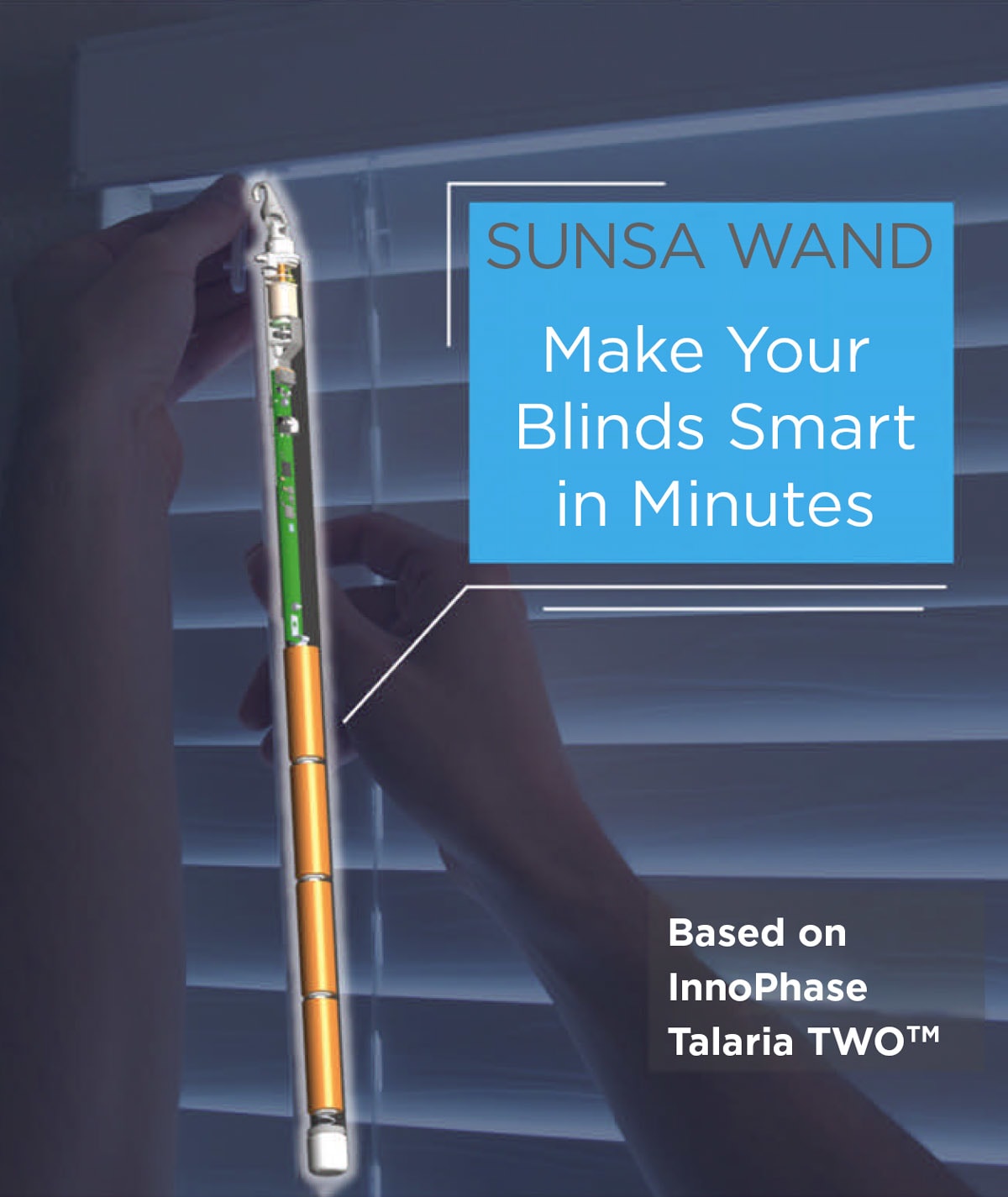 The benefits of the Talaria TWO platform are on display in the differentiated products it enables. One of InnoPhase’s first customers to integrate Talaria TWO into an IoT consumer product is Sunsa. They developed the Sunsa Wand window blind — a motorized, cloud-connected window blind adapter for consumer and commercial applications that allows any standard window blind to become a smart blind.