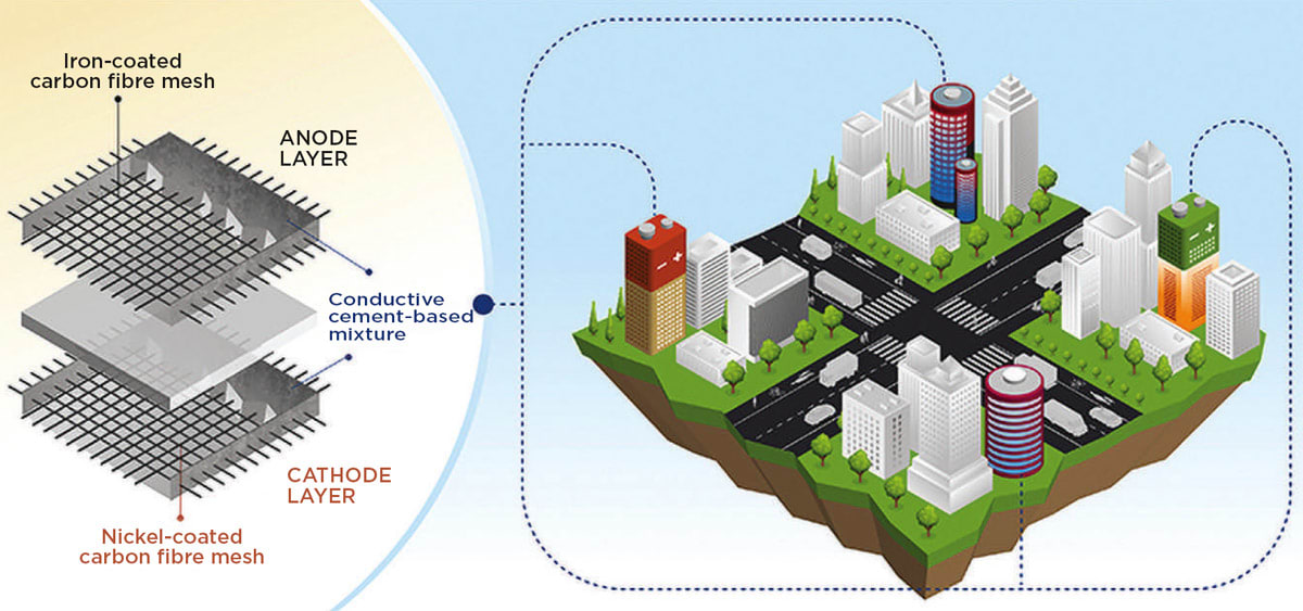 Researchers developed a concept for rechargeable batteries made of cement. The concept starts with a cement-based mixture with small amounts of short carbon fibers added to increase the conductivity and flexural toughness. Then, embedded within the mixture is a metal-coated carbon fiber mesh — iron for the anode and nickel for the cathode.