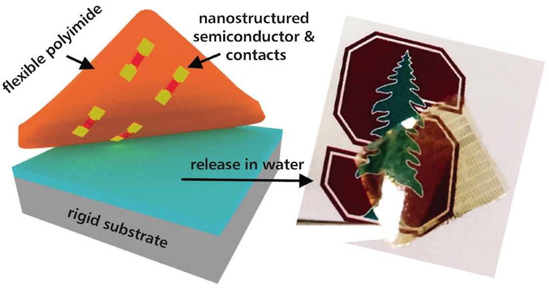 By first patterning and forming these critical parts on rigid silicon and allowing them to cool, the researchers can apply the flexible material without damage. With a simple bath in deionized water, the entire device stack peels back, now fully transferred to the flexible polyimide.