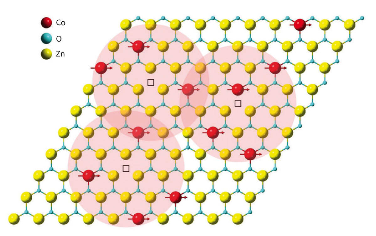 Zinc oxide’s free electrons could act as an intermediary that ensures the magnetic cobalt atoms in the new 2D device continue pointing in the same direction — and thus stay magnetic — even when the host (in this case, the semiconductor zinc oxide) is a nonmagnetic material.