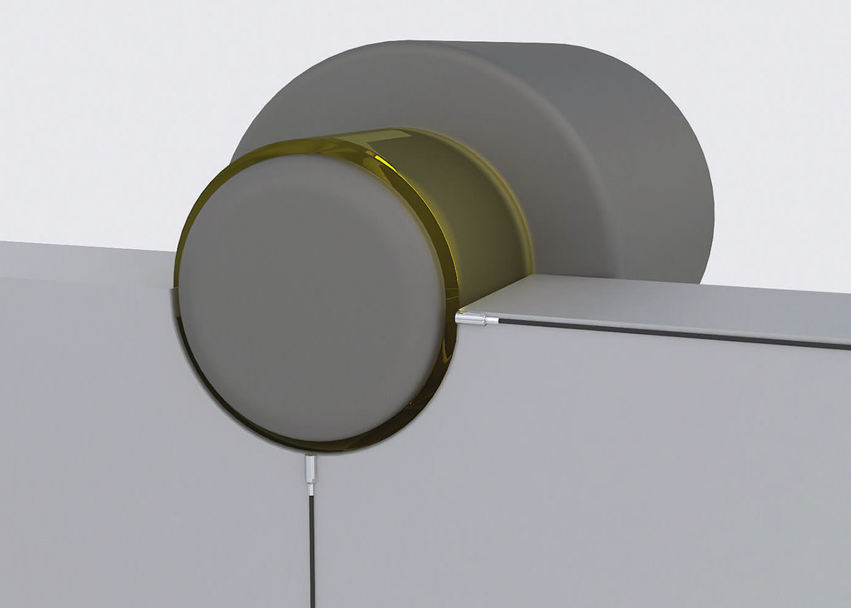 One application for eddy current displacement sensors is in large machinery such as stone mills or telescopic installations, which often work with hydrostatic bearings. These bearing systems are continuously supplied with liquid lubricant via an external pressure supply. The lubricant is pressed between the bearing surfaces, which are therefore continuously separated from one another by a thin lubricant film. The bearing surfaces are not exposed to friction and hence operate wear-free. This enables sub-micrometer position control. Any disturbances in the hydraulics, or drops in pressure, however, can have disastrous consequences. This could result in damage to the bearings and ultimately system failure, causing high maintenance and repair costs. The oil gap in hydrostatic bearings, therefore, requires continuous reliable inspection. For this application, the sensor is mounted horizontally to the bearing shoe, so it is not directly exposed to the oil pressure. It measures through the oil film onto the opposing bearing surface.