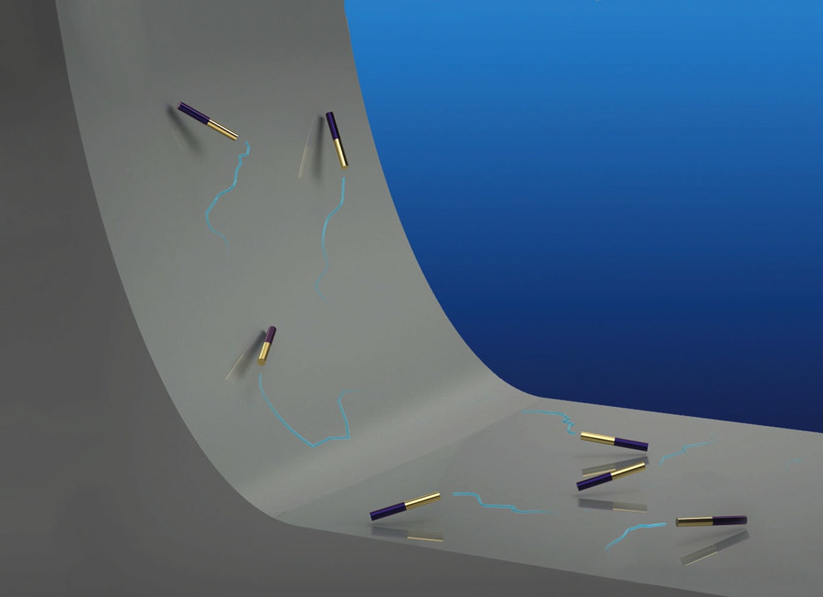 The motorized swimmers, or nanorods, are roughly 1/40th the width of a strand of human hair and were tasked with moving up an inclined surface while immersed in a liquid solution within a walled container. The swimmers were composed of two types of metal: gold and rhodium as well as gold and platinum — a make-up that gave them unbalanced densities given the varying weights of these metals. The swimmers’ composition, liquid environment, and juxtaposition of surfaces enabled them to move upward, despite their significant weight.