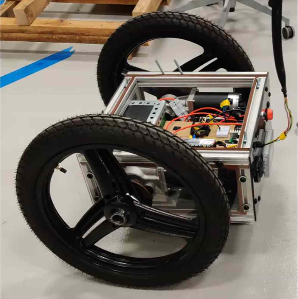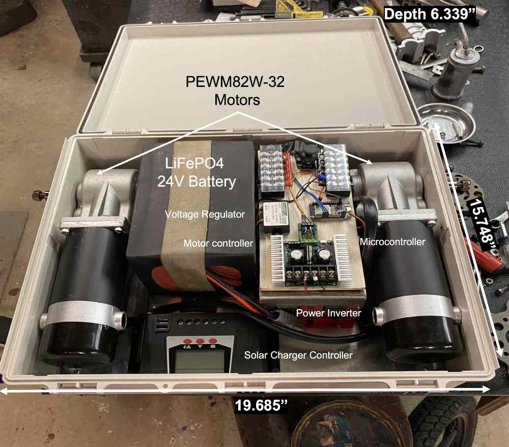 The enclosure supports a max load of 300 lbs, and the motors provide enough power to carry a load uphill and downhill. The case and frame, built from 80/20 T-slot aluminum and plexiglass, make the system both water-resistant and durable.