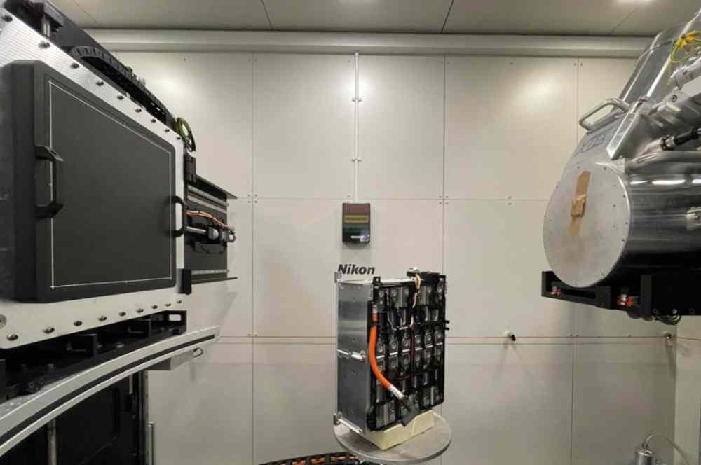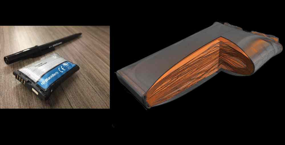 CT inspection shows swelling in a pouch battery after a thermal event. (Image Credit: Nikon)