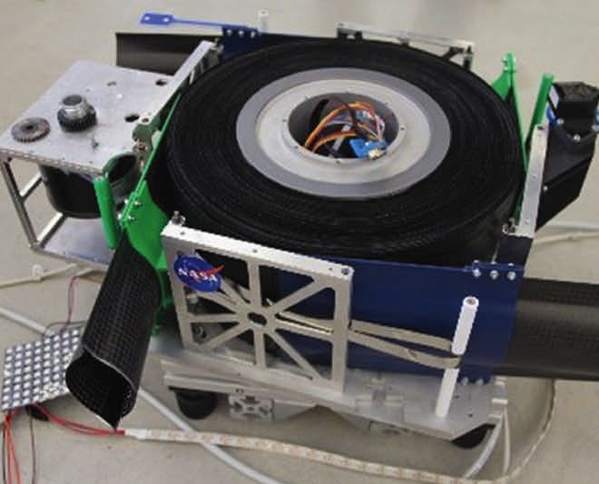 Just like a kid’s “slap bracelet,” the Bi-CTM design includes a secondary, stable, low-energy state aside from the rigid deployed state. The result is that the Bi-CTM is not under high-spring stress when coiled up, which simplifies the stowage process as well as enabling a more controllable extension of the boom. The simplified stowage process enables reduced size, mass, and complexity of the storage and deployment mechanism system.