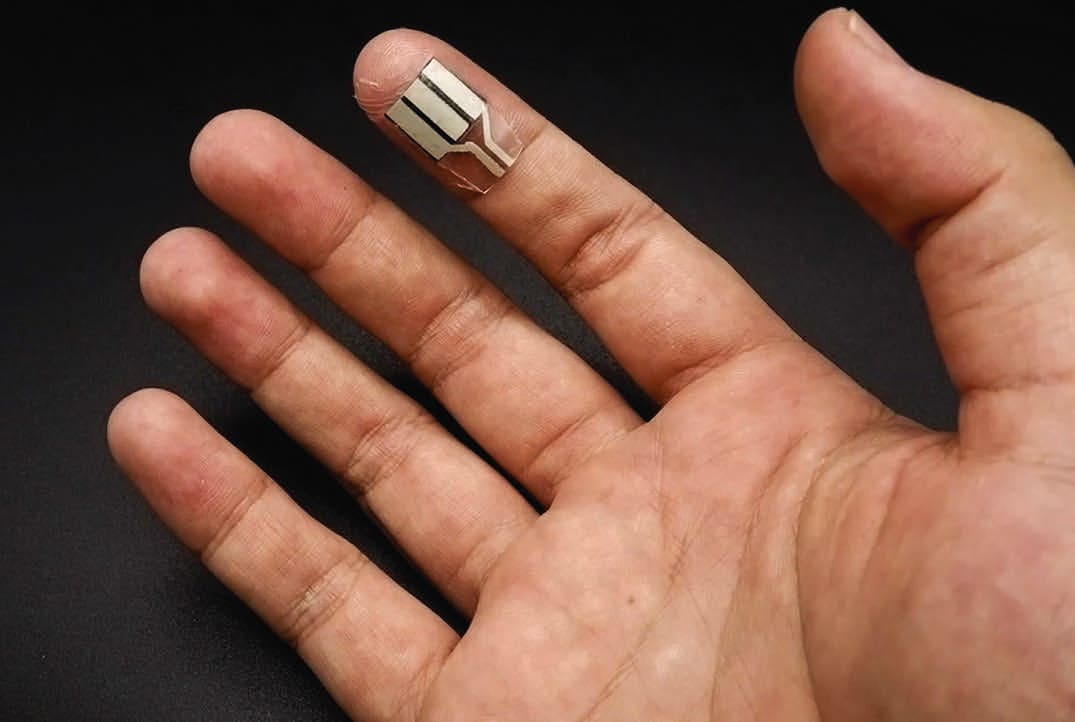 A thin, flexible strip can be worn on a fingertip to generate small amounts of electricity when a person’s finger sweats or presses on it. It generates power even while the wearer is asleep or sitting still, requiring no exercise or physical input. The wearable energy harvester generates extra power from light finger presses — activities such as typing, texting, or playing the piano become sources of energy. A padding of carbon foam electrodes absorbs sweat and converts it into electrical energy. The electrodes are equipped with enzymes that trigger chemical reactions between lactate and oxygen molecules in sweat to generate electricity. Underneath the electrodes is a chip made of piezoelectric material that generates additional electrical energy when pressed. As the wearer sweats or presses on the strip, the electrical energy gets stored in a small capacitor and is discharged to other devices when needed.
